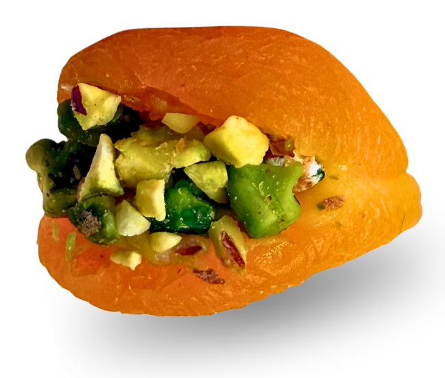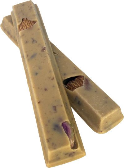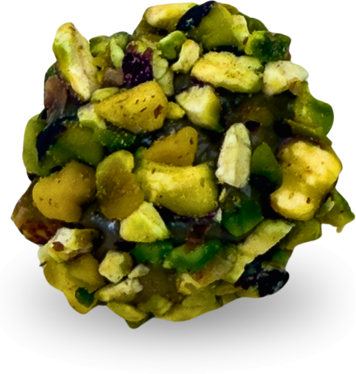 Pistache com Framboesa Combinação refinada entre o sabor intenso do pistache e a leve acidez da framboesa, envolto por uma cobertura fina de chocolate branco.