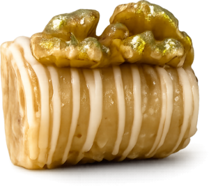 Camafeu de Nozes Doce tradicional de nozes com cobertura fondada e acabamento clássico.